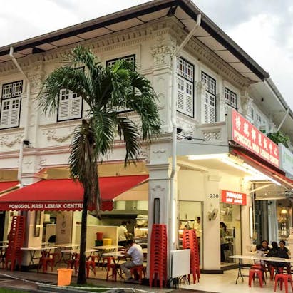 The neighborhood is a hotspot for culinary delights, featuring iconic local dishes like laksa and kueh, alongside trendy cafes and international cuisine options, making it a haven for food enthusiasts.